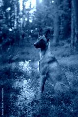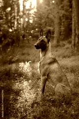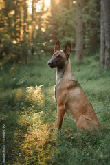 A Belgian Malinois stands alertly in a forest illuminated by the warm sunset glow. The natural backdrop adds depth to the dog strong posture.
