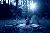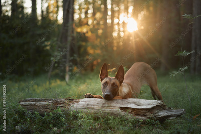A Belgian Malinois rests on a wooden log in a forest illuminated by golden sunset light. The tranquil setting highlights the calmness of the dog in nature.