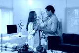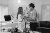Woman is helping her husband put on an apron, getting ready to cook a healthy meal together in their modern kitchen, surrounded by fresh vegetables and takeaway containers