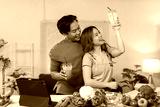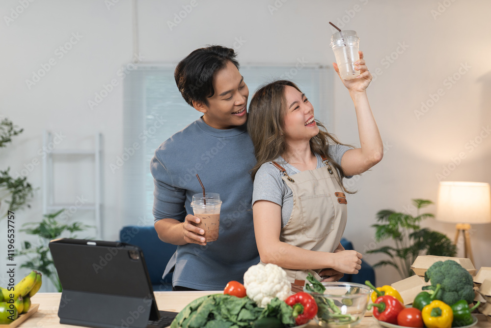 Young couple having fun while preparing ingredients and holding takeaway drinks in the kitchen, using a tablet for a recipe or online cooking class