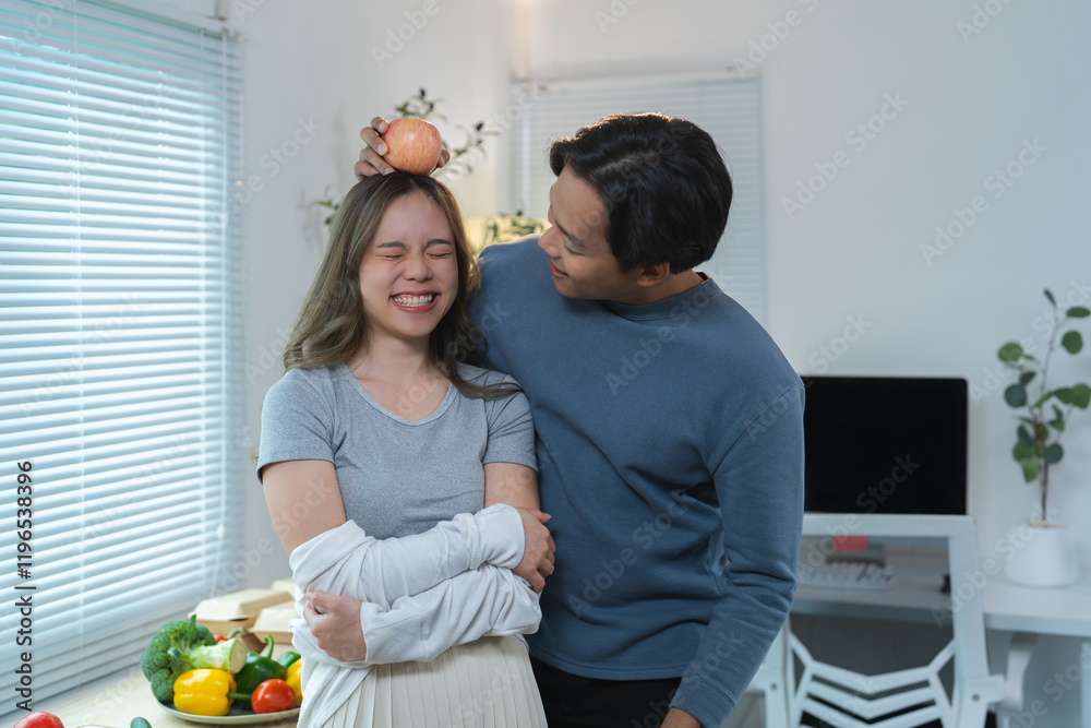 Young asian couple having fun in the kitchen, the man is placing an apple on the woman's head, she is laughing with closed eyes, vegetables are on the kitchen counter