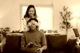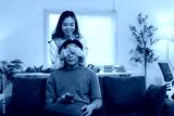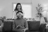 Happy smiling asian woman covering eyes of her boyfriend holding remote control sitting on blue sofa in living room at home, making surprise for him