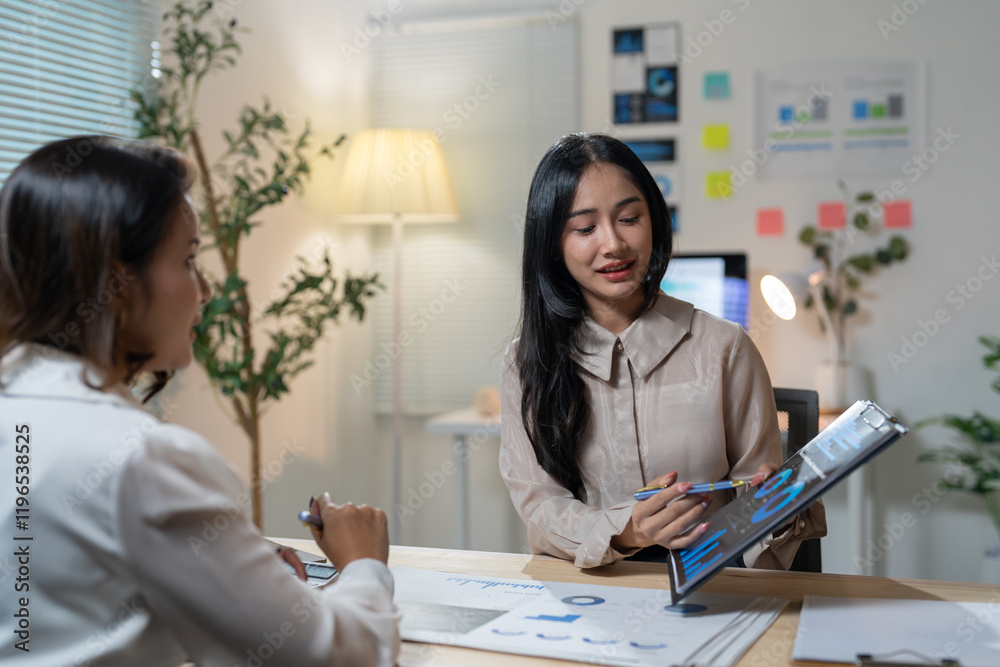 Two young businesswomen are sitting at a desk in a meeting room, discussing and analyzing financial graph charts using documents and a laptop
