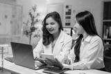 Two young businesswomen are working together in office at night, using a laptop and calculator to analyze financial data, discussing and smiling