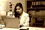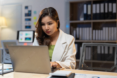 Young asian businesswoman concentrating on her work on a laptop, working late at night in a modern office, demonstrating dedication and professionalism