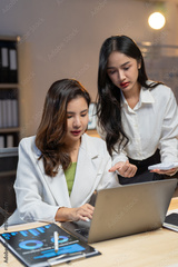 Two young asian businesswomen are working together in office at night, analyzing financial charts and using laptop computer for business strategy
