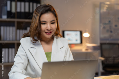 Young asian businesswoman smiling and working on a laptop in a modern office at night, with a desktop computer and documents in the background