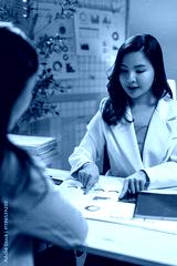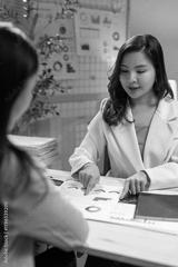 Two asian businesswomen are sitting at a desk in a modern office, discussing financial data and pointing at charts and graphs during a productive meeting