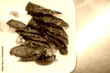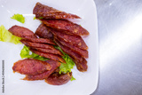 Slice of Chinese and Thai style sausages on with dish