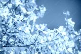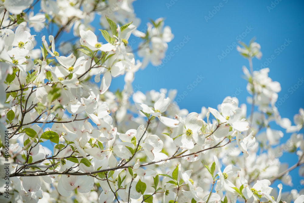 natural spring Easter outdoor background. Delicate spring beautiful bloom of white large flowers on tree branches. Large white flowers of Dogwood tree