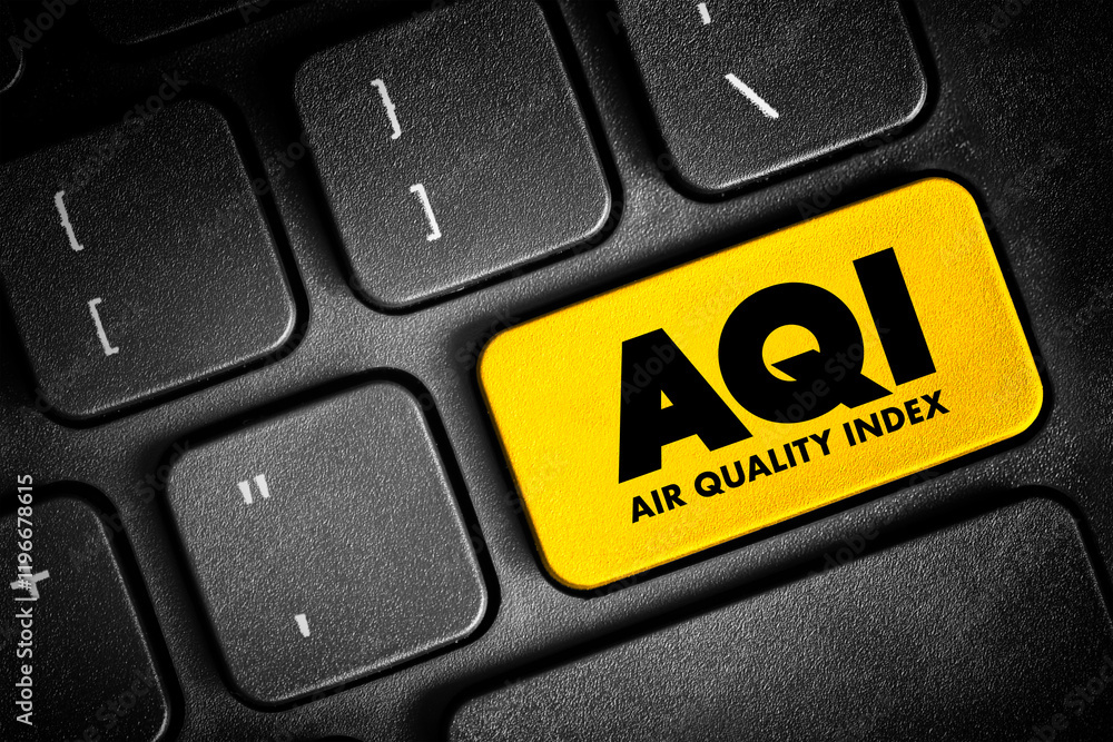 AQI - Air Quality Index is used by government agencies to communicate to the public how polluted the air, acronym text button on keyboard, concept background