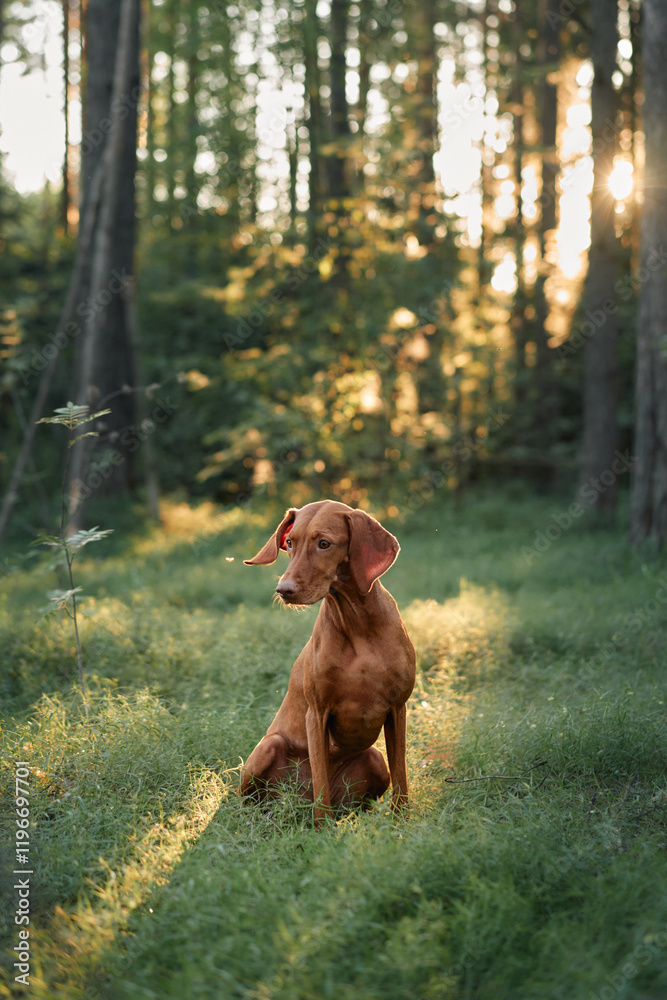 A Hungarian Viszla sits calmly under tall trees in a forest clearing. The serene scene showcases the natural beauty of the dog and its environment.