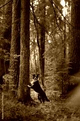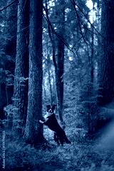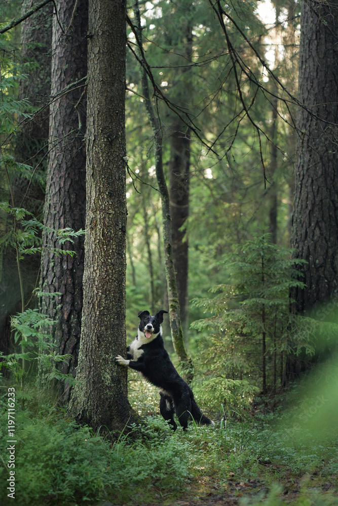 Two Border Collies playfully interact near tall trees in a serene forest clearing. The dynamic moment captures their energetic and joyful nature in a vibrant setting.