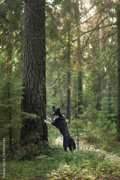A Border Collie climbs a tree trunk in a lush forest clearing with soft sunlight. The active pose highlights the dog agility and playful personality.