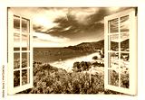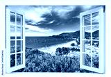 Window with a view of the ocean and mountains