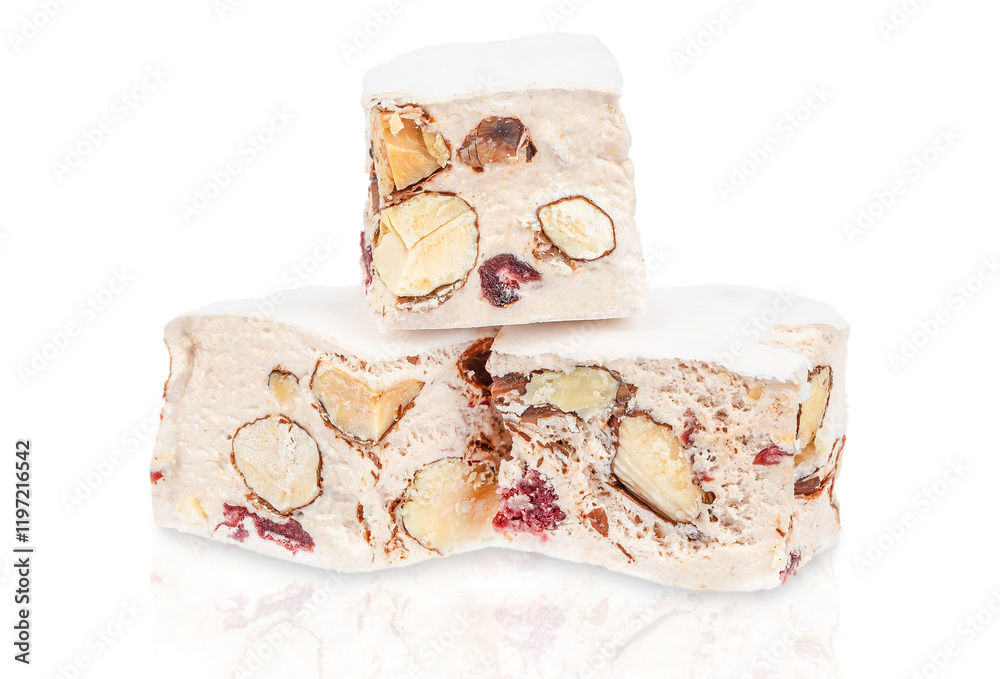 Torrone Nougat A chewy confection made from honey, sugar, egg whites, and nuts isolated on white background