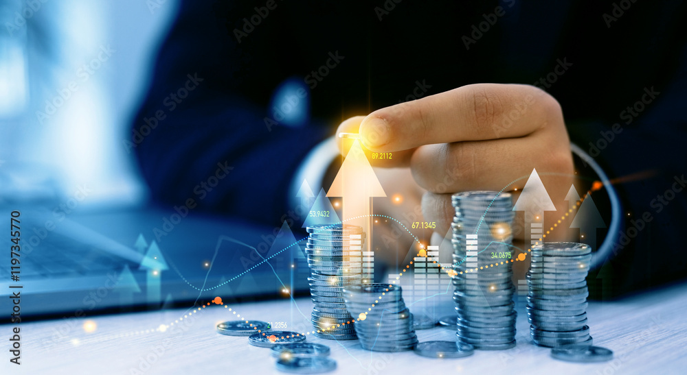 Saving money concept.Stack of coins with trading price graph growth.Money business financial graph diagram of coin. Financial growth data or investment market profit bar and success report.