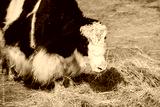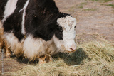 Black and white yak walking and eating hay. Shaggy woolly bull