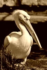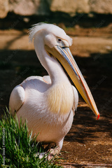 A white pelican bird stands on the grass