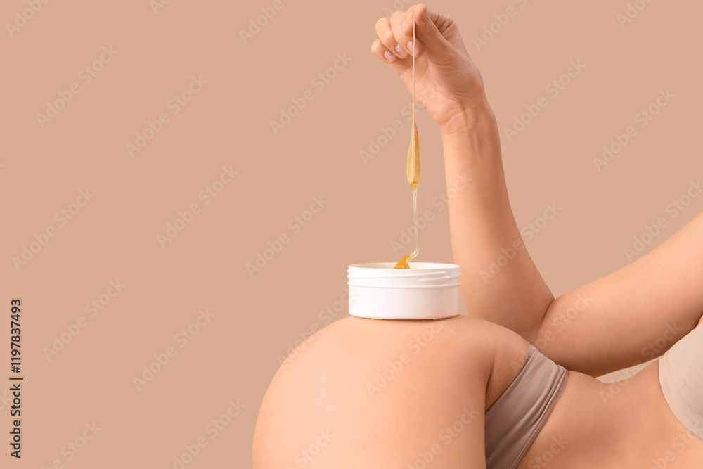 Beautiful young woman holding container with sugaring paste and spatula on brown background, closeup