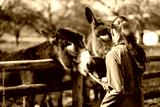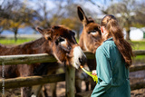 Girl in green jacket feeding donkeys over fence