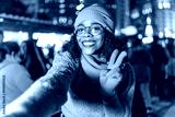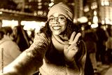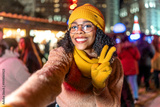 Young woman taking selfie at christmas market showing victory sign