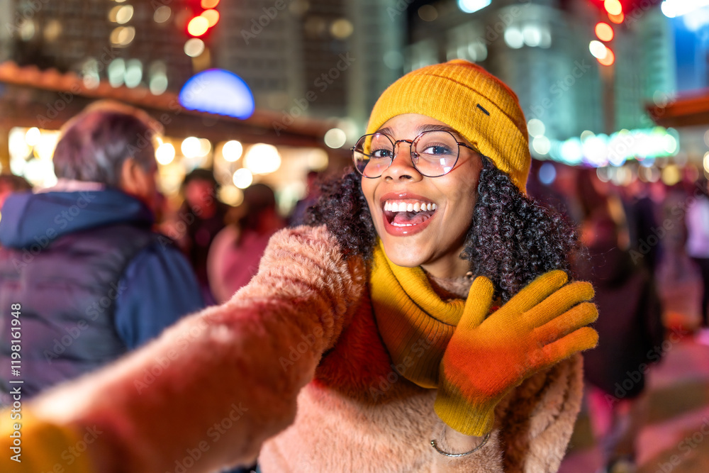 Young woman taking selfie at christmas market wearing yellow winter clothes