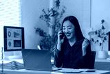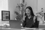 Happy young office worker celebrating success while talking on smartphone and looking at laptop screen, showing positive emotions, receiving good news or successful deal