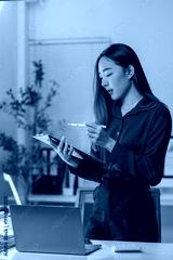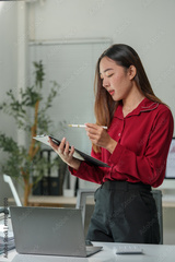 Young asian businesswoman wearing red shirt and black trousers standing at her desk reading documents and pointing with a pen while working on a laptop in a modern office