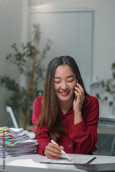 Young office worker smiling and using smartphone while analyzing documents at workplace, busy entrepreneur managing business from modern company office