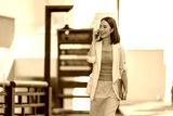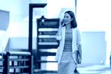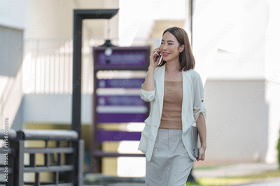Businesswoman is walking outside her office building while talking on her phone and holding a laptop, enjoying a productive workday in the city