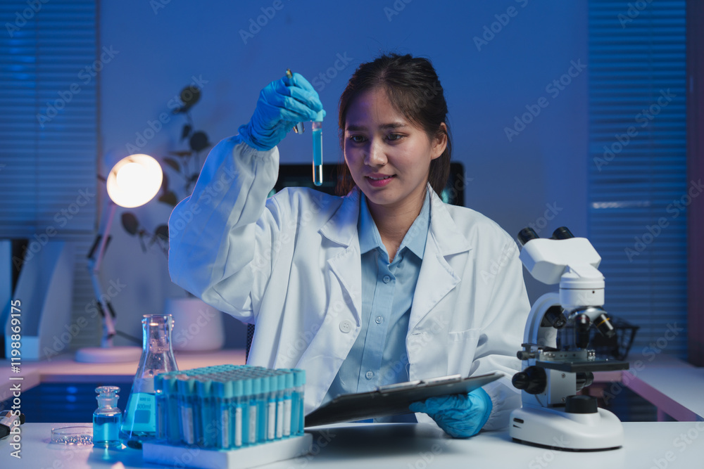 Young scientist wearing lab coat and gloves analyzing a test tube containing blue liquid while taking notes, with microscope and other lab equipment on table at night