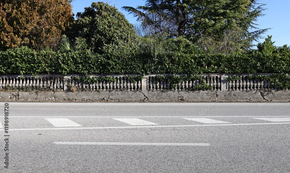 Fence consisting by rough concrete wall with a classic balustrade and hedge on top . Trees on behind and multiple lane road in front. Background for copy space.