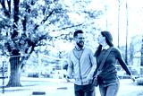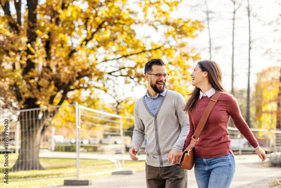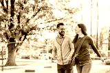 Happy couple holding hands and strolling in city park while smiling at each other.