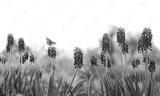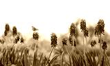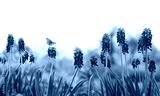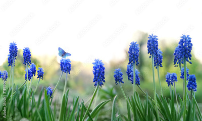 Beautiful blue Muscari flowers and butterfly on spring meadow, floral abstract nature. spring blossom season background. Gentle colorful artistic nature image.