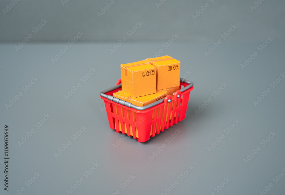 A basket with boxes of goods. Buyer behavior, consumer patterns and preferences. Logistics and supply of retail outlets.