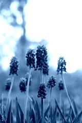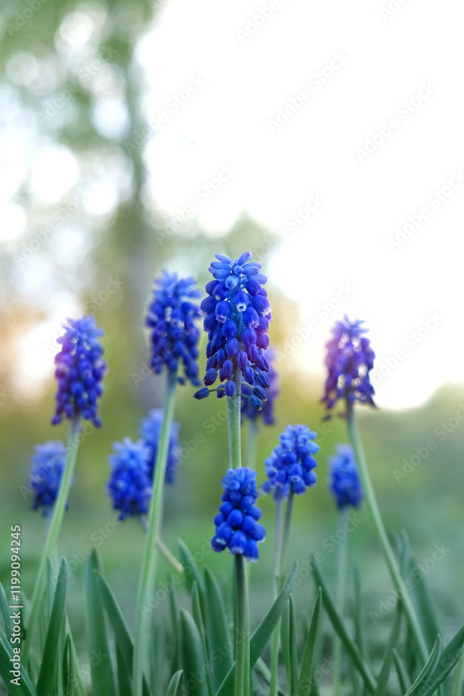 Beautiful blue Muscari flowers on spring meadow close up, floral abstract nature. spring blossom season background. Gentle colorful artistic nature image.