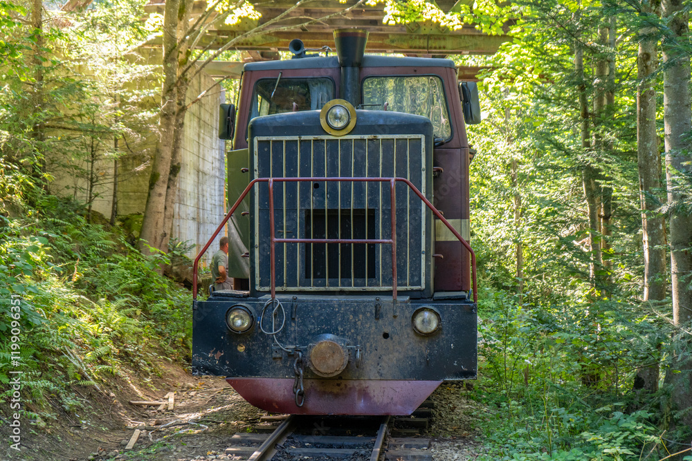 Carpathian tram cabin. Steam locomotive on a narrow-gauge railway. Old transport in the forest nature