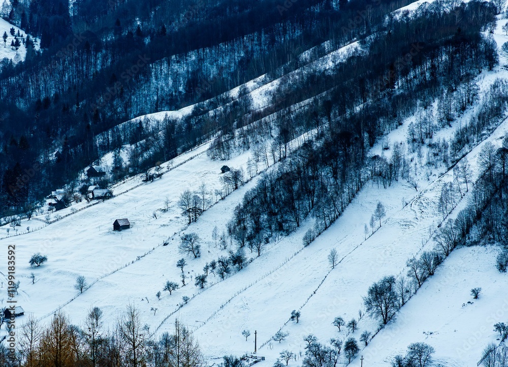 Snow-covered hills with scattered trees and small cabins create a serene winter landscape.