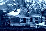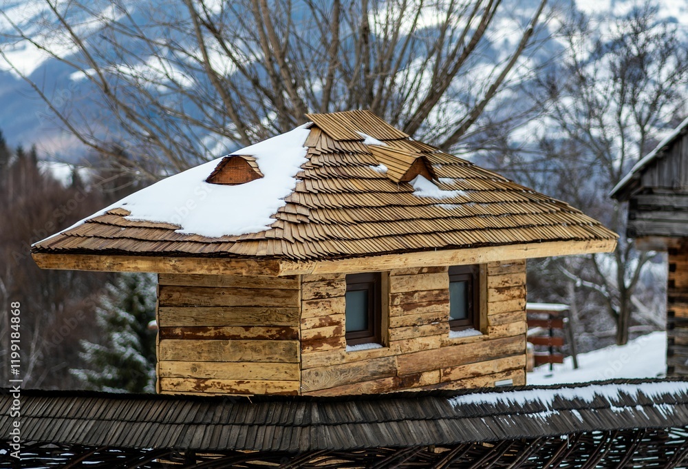 Rustic wooden cabin with snow-covered roof set in a serene winter landscape
