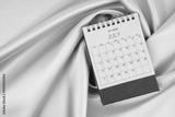 July 2025 craft brown paper desk calendar on pink silk textile background.