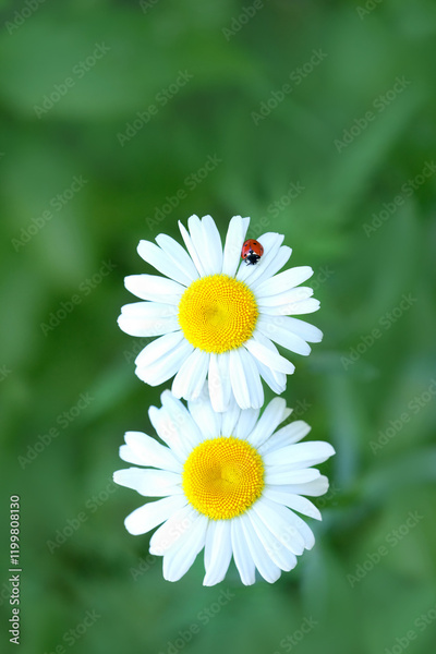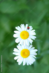 ladybug on chamomile flower close up, green natural background. spring summer season. symbol of purity freshness nature, organic, ecological life. beautiful nature scene. copy space