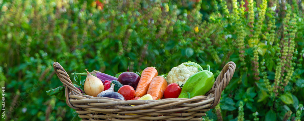 Fresh organic vegetables in a basket in the garden. Selective focus