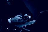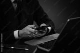 man holding a smartphone while typing on a laptop keyboard in an office or home setting, representing online work, business tasks, emails, and internet communication using technology.