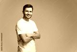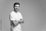 Smiling man with crossed arms wearing a white t-shirt poses confidently in a studio setting