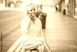40s mid age blond woman on the mobile phone talking and resting on bench in the city. Adult female talks on the smartphone phone.