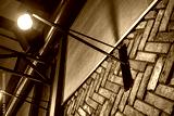 A sleek industrial-style wall lamp mounted against a rustic herringbone brick wall. The combination of modern lighting and exposed brick creates a contemporary, cozy atmosphere