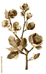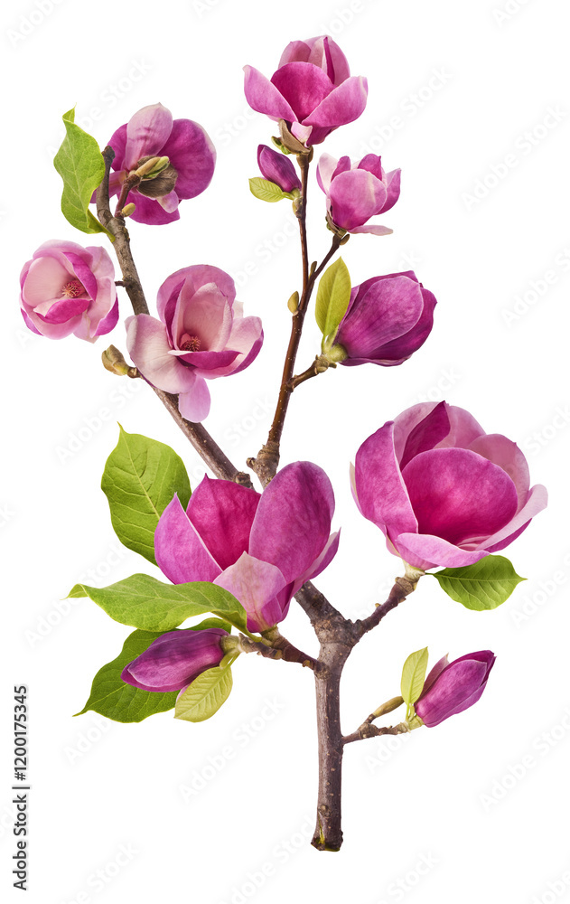 A branch full of magnolia blooming. Beautiful pink Magnolia flower falling in the air isolated on white background. Zero gravity conception