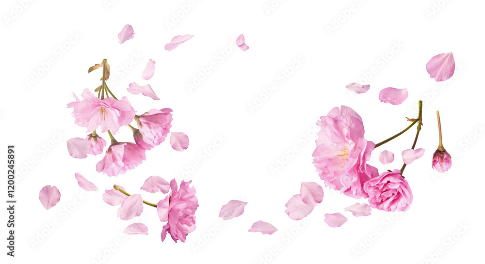 Beautiful blooming of delicate pink Sakura flowers falling in the air, isolated on white background. Zero gravity or levitation spring flowers conception, high resolution image