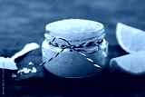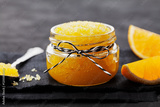 Orange body scrub with sugar and coconut oil in glass jar on black table. Homemade cosmetic for peeling and spa care